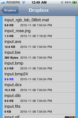 We are licensed to use the Dropbox developer api. Tap to navigate the folder hierarchy, or tap to download a file. We show the file download progress as Dropbox gives us the contents of the file, once downloaded the file size will turn to blue to indicate we have a copy of the file on the iOS device for immediate access.